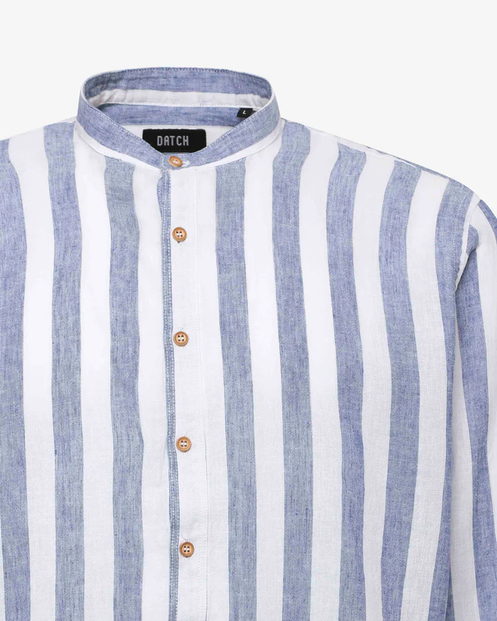 Camicia in lino leggera e traspirante con collo coreano e stampa a righe. Perfetta per un look raffinato e casual.